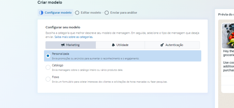 Selecione a opção Marketing (campanhas de marketing) ou Utilidade (mensagens transacionais) e mantenha a opção como Personalizada e clique no botão abaixo Avançar