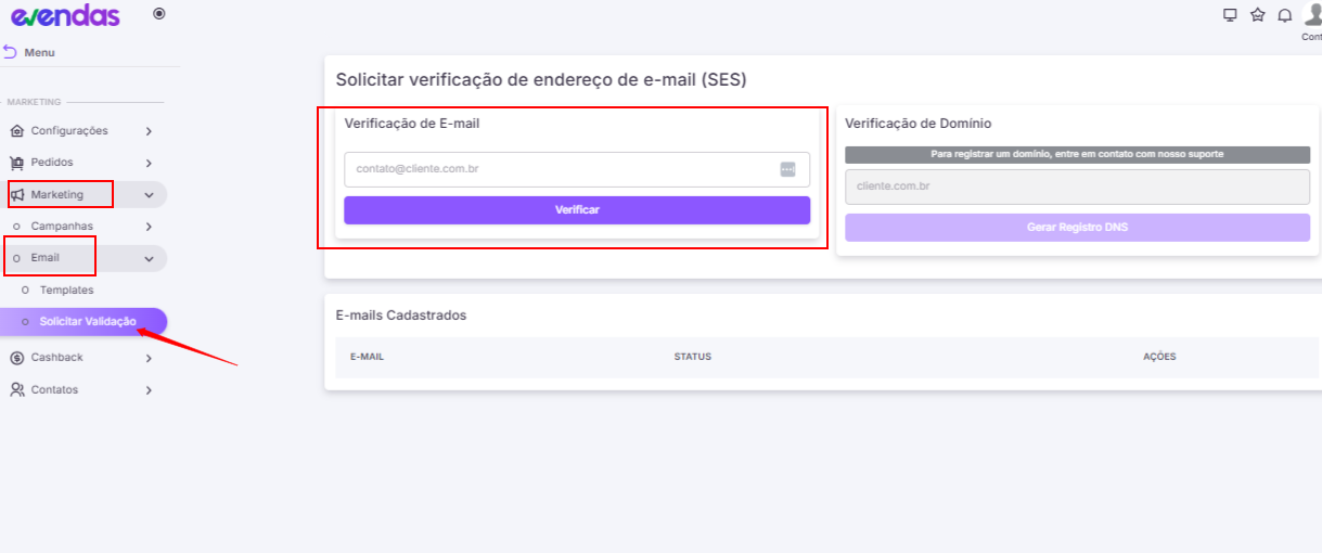 Para validar um e-mail de remetente acesse o Módulo de Marketing através do link https://menu.e-vendas.net.br