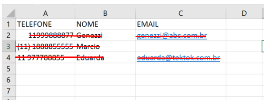 Atenção: O nome das colunas precisa ser exatamente igual a este (Exemplo ERRADO: "E-mail" / Exemplo CORRETO: "Email")Como irá utilizar apenas e-mail, o telefone e nome podem deixar em branco, mas o cabeçalho precisa manter. Mas caso queira subir uma planilha completa para usar para disparos de WhatsApp também pode subir com o telefone preenchido para aproveitar o mesmo arquivo em várias campanhas.