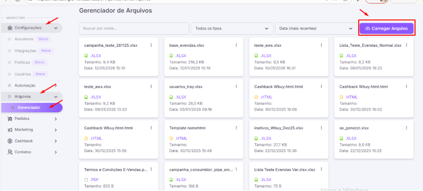 Para subir esse arquivo vá até o menu Configurações > Arquivos > Gerenciador e clique no botão Carregar Arquivo